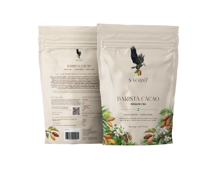 Saoró Barista Cacao is made from single-origin Sierra Leone beans, expertly crafted by our chocolatier partners for a velvety, barista-ready experience.